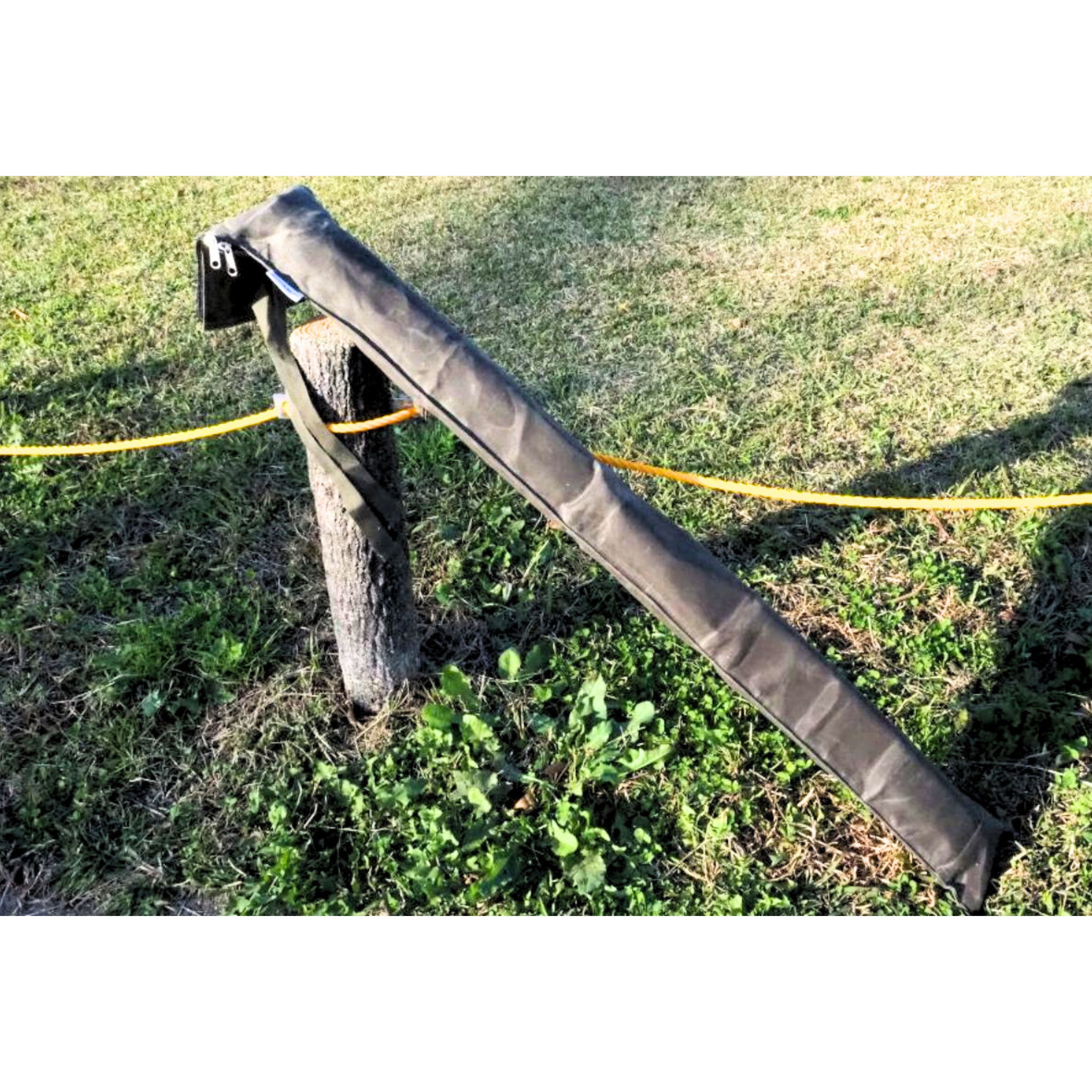 ●車での運搬中に収納物が飛び出さないように、ケースの口部分にシルバー金具のダブルファスナーが付いているので安心です。ケースより長い物を収納するときは、口部分に付いているバンドでとめることができます。