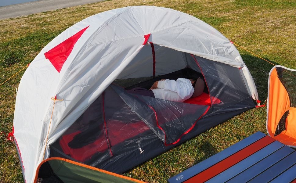 ●テント内に荷物を入れても大人ひとり寝ることができるスペースは充分あります。全体的に解放感あるゆったりとした空間を演出しています。