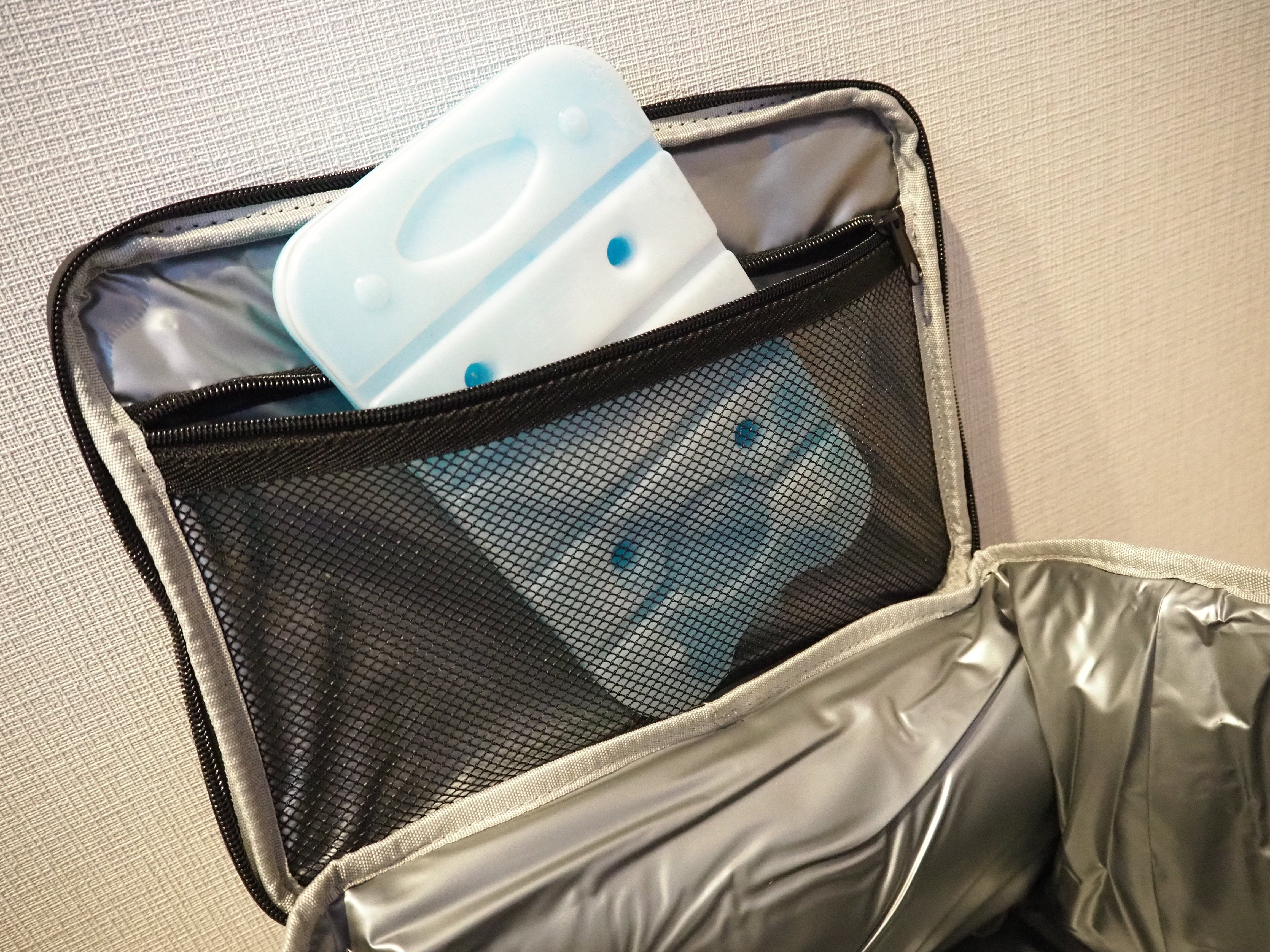●天面内側に保冷剤を入れるメッシュポケット(約26.5㎝(幅)x14.5㎝(高))があります。ポケットは、ファスナータイプなので移動中に収納物が飛び出す心配はありません。