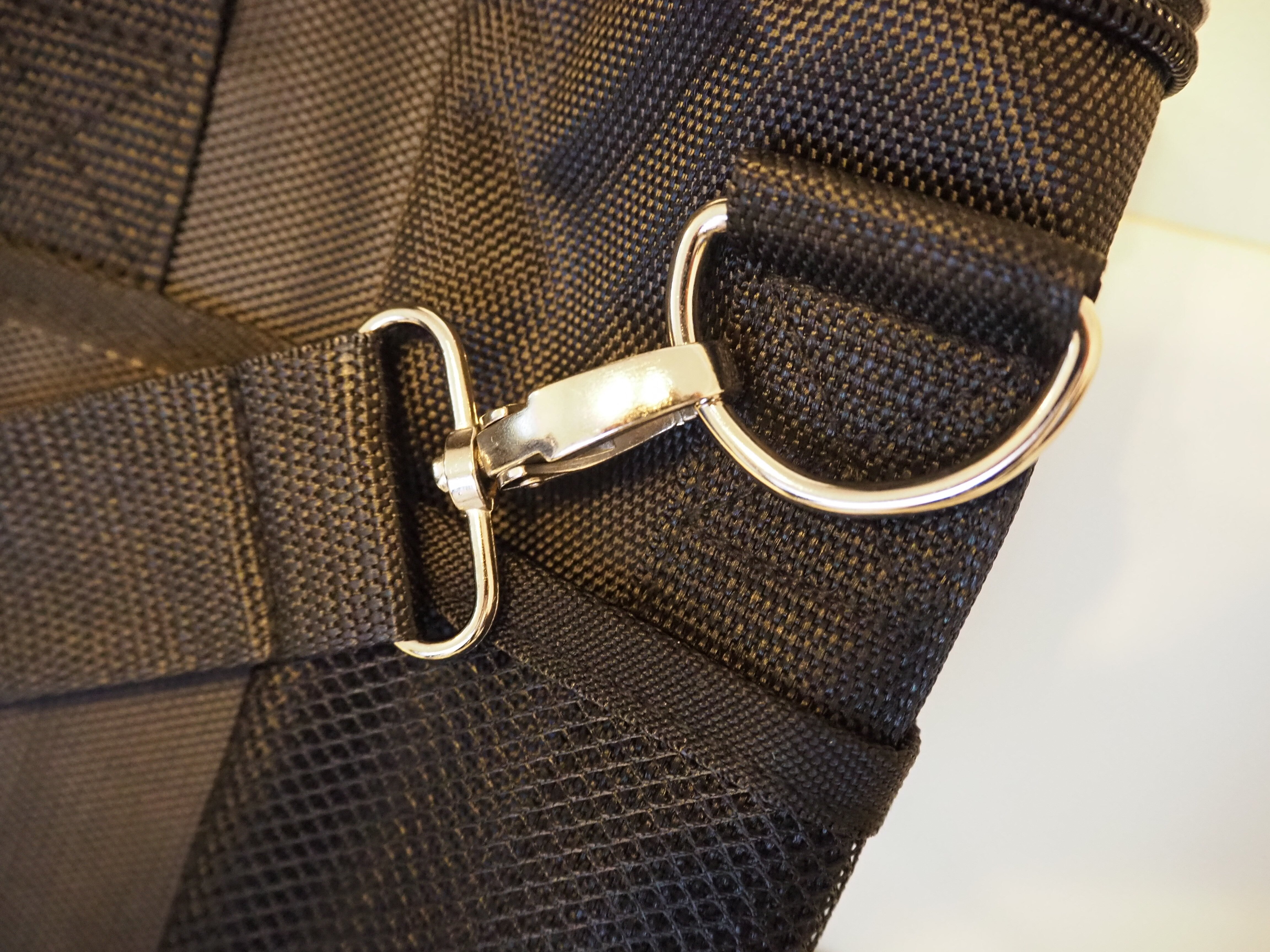 ●バッグ外側の両サイドにメッシュポケットがあります。向かって正面左側に約9.5㎝(幅)x14.0㎝(高)のサイズのポケットが2つ、向かって正面右側に約19.0㎝(幅)x14.0㎝(高)のサイズのポケットが1つとなります。