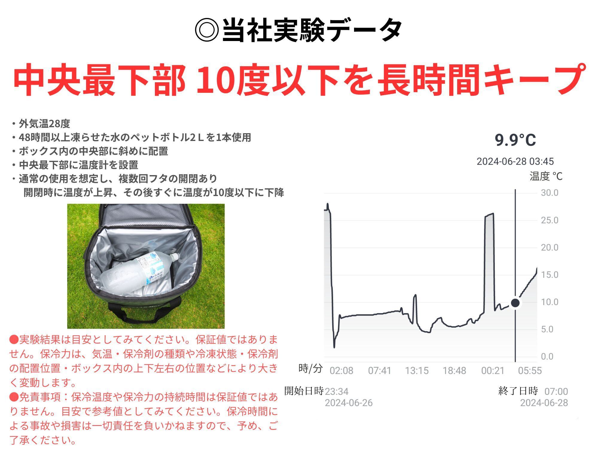 2.ボックス最下部中央の温度10度以下を長時間キープ!(凍らせたペットボトル水2Lを1本使用した場合の当社実験データによる*保証値ではありません)